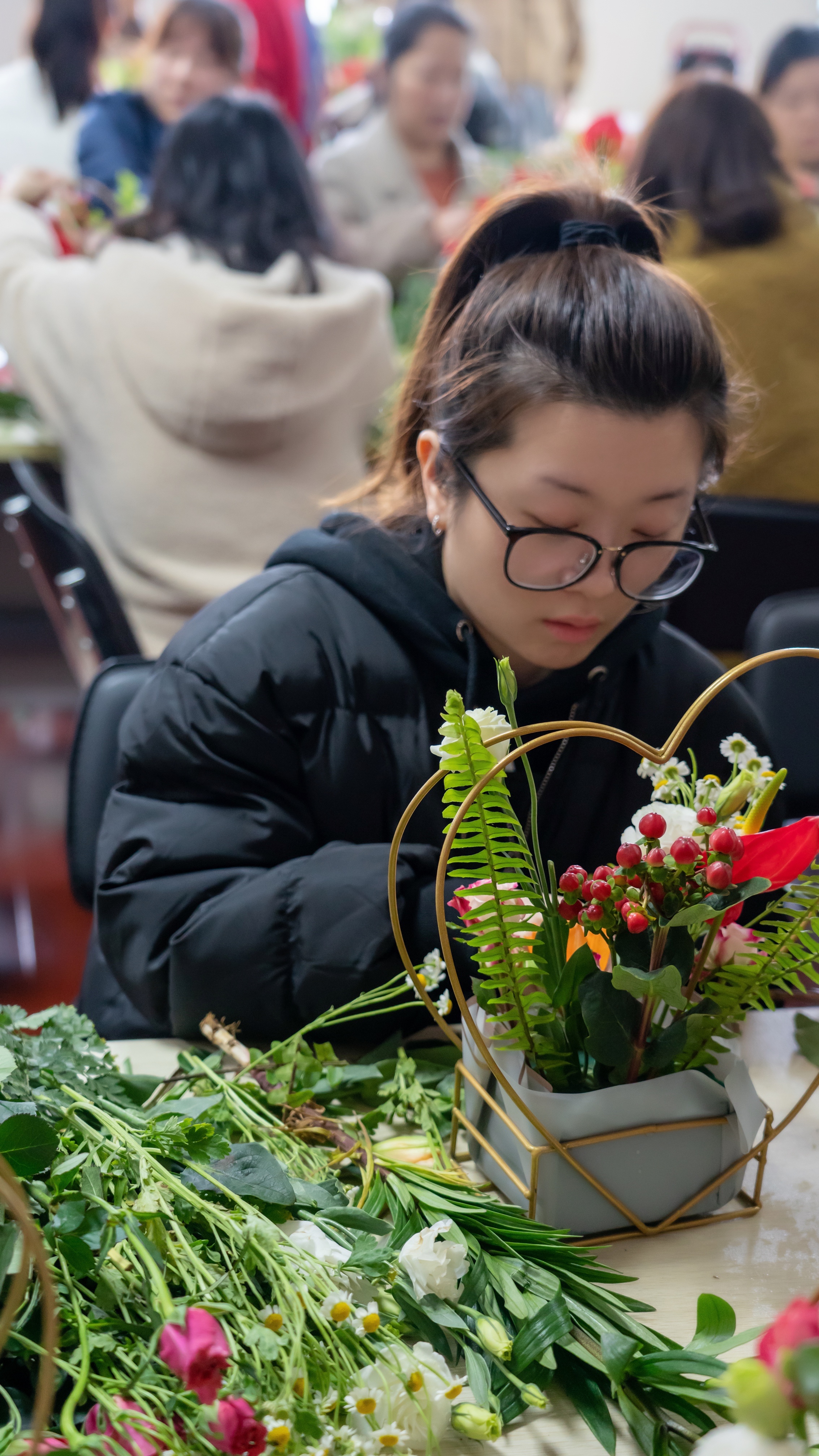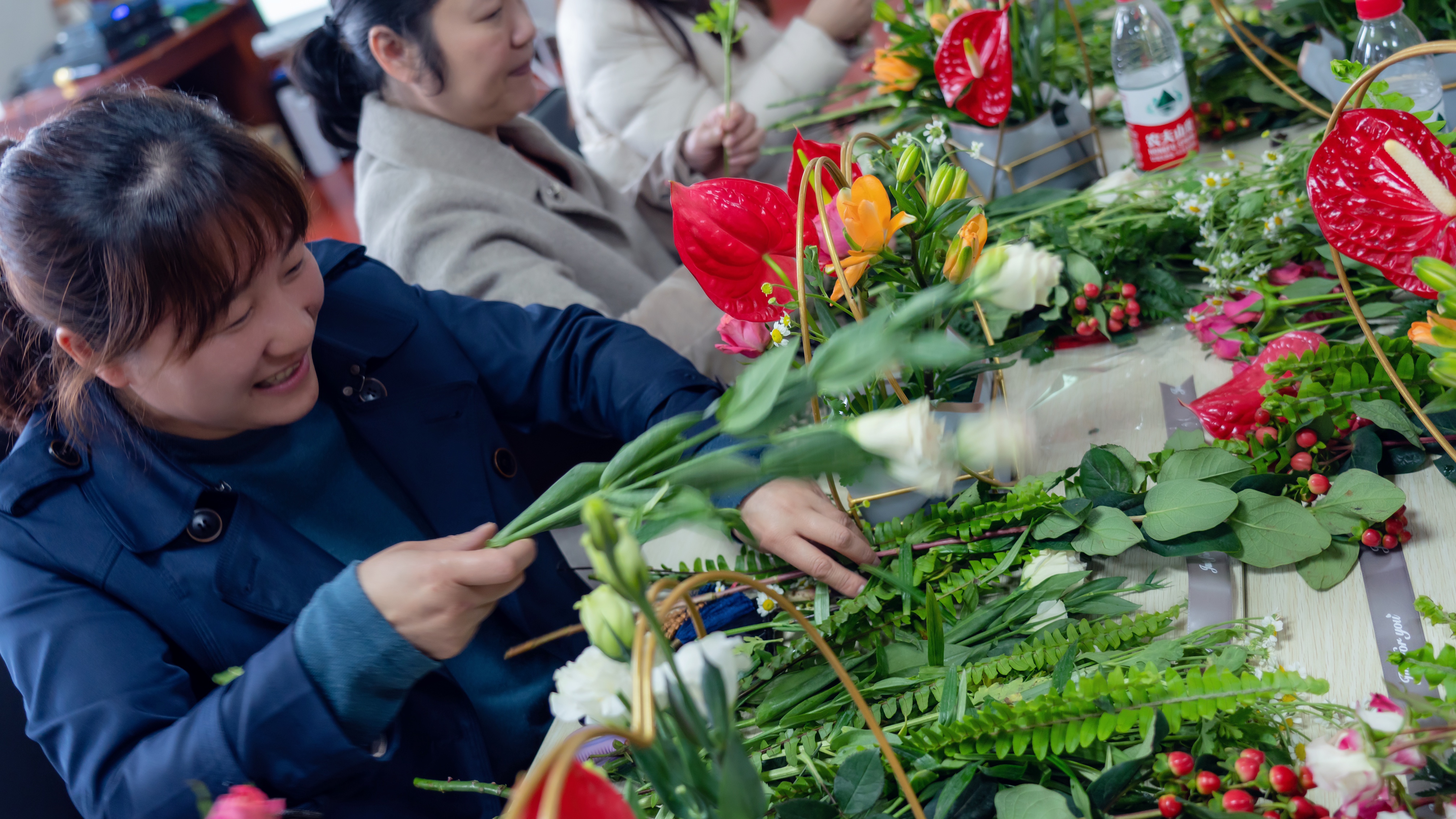 活動現(xiàn)場,花藝?yán)蠋煘榕毠冎v授了插花藝術(shù)的基本知識、插花造型、色彩應(yīng)用要點(diǎn)等,并現(xiàn)場演示插花技巧。聽著老師詳細(xì)的講解,大家邊聽邊學(xué)興致勃勃地創(chuàng)作自己的作品,忙得不亦樂乎……一束束融合了女職工們豐富想象力的插花作品展現(xiàn)在大家的面前,女職工們開心的笑容與花朵相互交融。